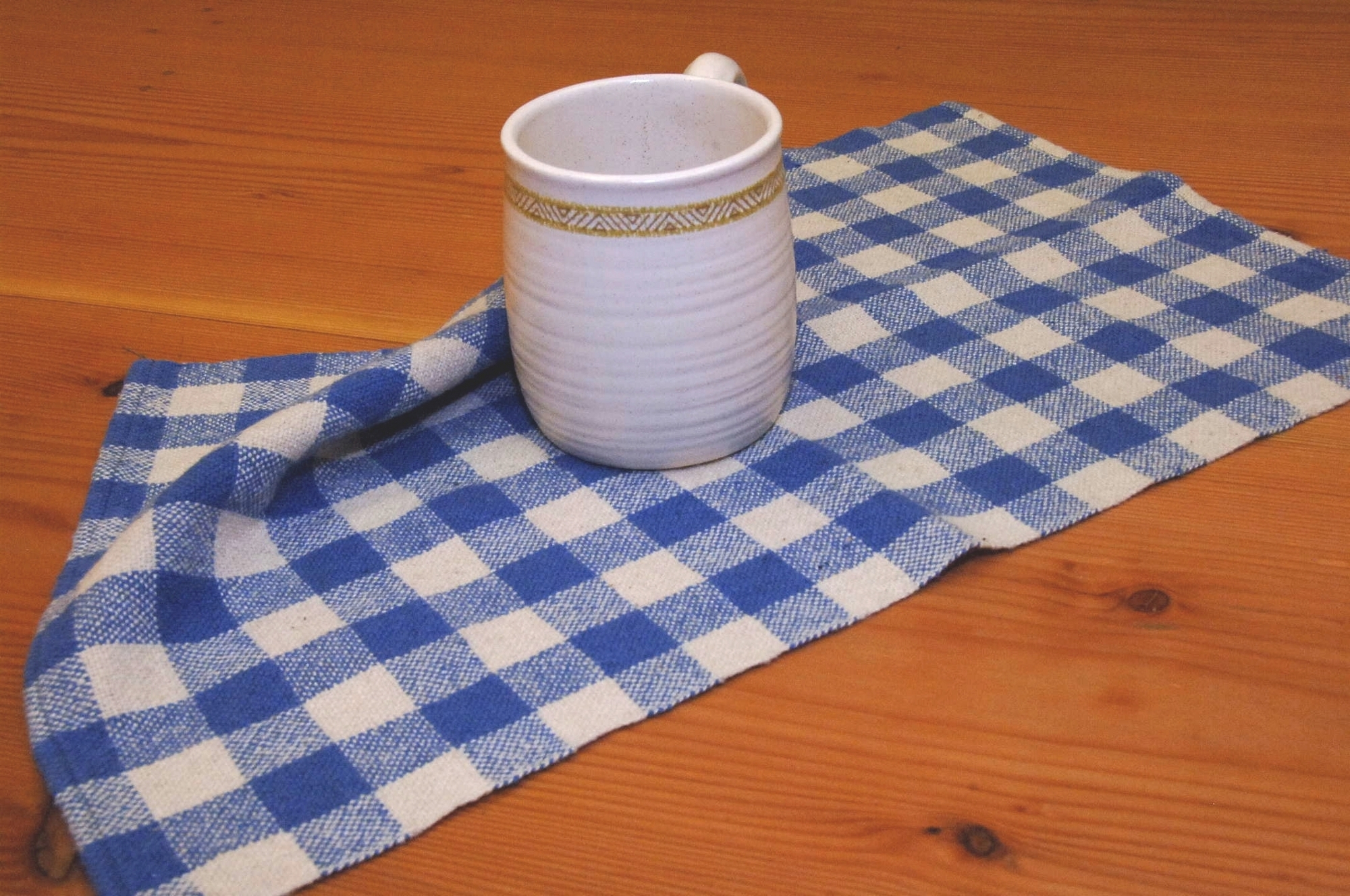 Checked Towels in Cottolin. These traditional towels are made of cottolin, which is a yarn that is a combination of cotton and linen. The linen helps the towels soak up water and also dry quickly. They are in plain weave.